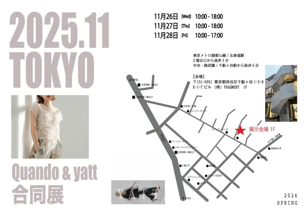 2025 東京千駄ヶ谷展示会 公開日:2026年2月20日 Uncategorized 11/26~11/28 東京千駄ヶ谷にて展示会を行います。 展示会案内状20251003 関連記事 2025AW 大阪サーカス合同展示会のお知らせ2025summer 大阪展示会のお知らせ2026年 3月 東京千駄ヶ谷展示会2025AW 受注会2025Summer2 東京展示会のお知らせ2026 1月 東京千駄ヶ谷展示会 大阪サーカス合同展示会 投稿ナビゲーション 2025 東京千駄ヶ谷展示会2026 1月 東京千駄ヶ谷展示会 大阪サーカス合同展示会